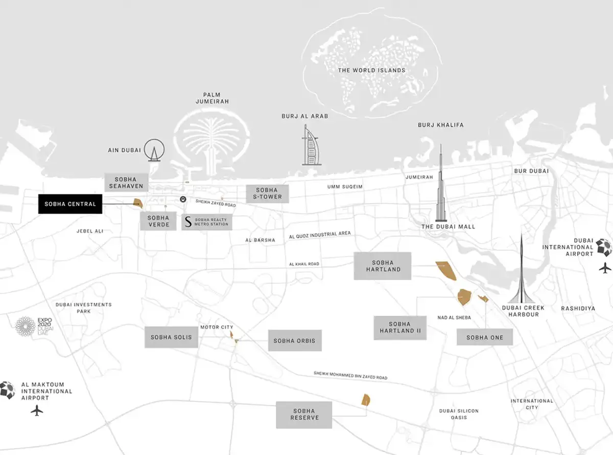 The Eden at Sobha Central by Sobha Group offers premium 1 & 2-bedroom apartments designed for modern urban living in Dubai. Located directly on Sheikh Zayed Road, this master-planned community combines luxury, connectivity, and peaceful elevated living.